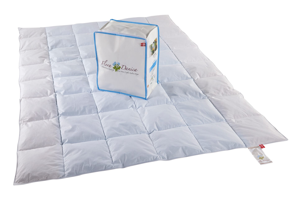 Dynen er fyldt med naturlige dun og omsluttet af finvævet bomuld med et elegant blåt kvadratisk mønster, der giver et eksklusivt udtryk.