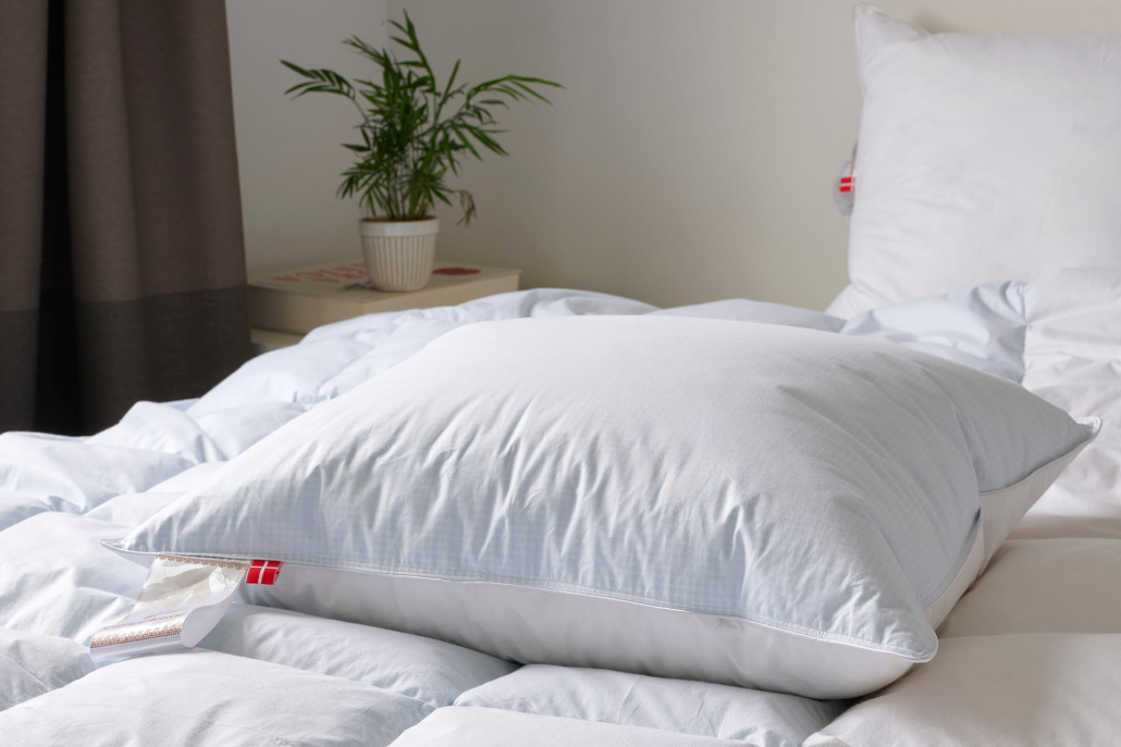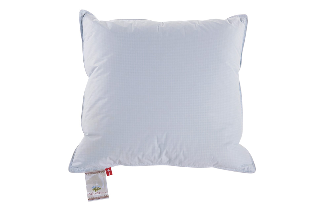 Puden er en 3-kammer konstruktion fyldt med naturlige dun og fjer, omkranset af finvævet bomuld med blåt kvadratisk mønster for et eksklusivt udtryk.